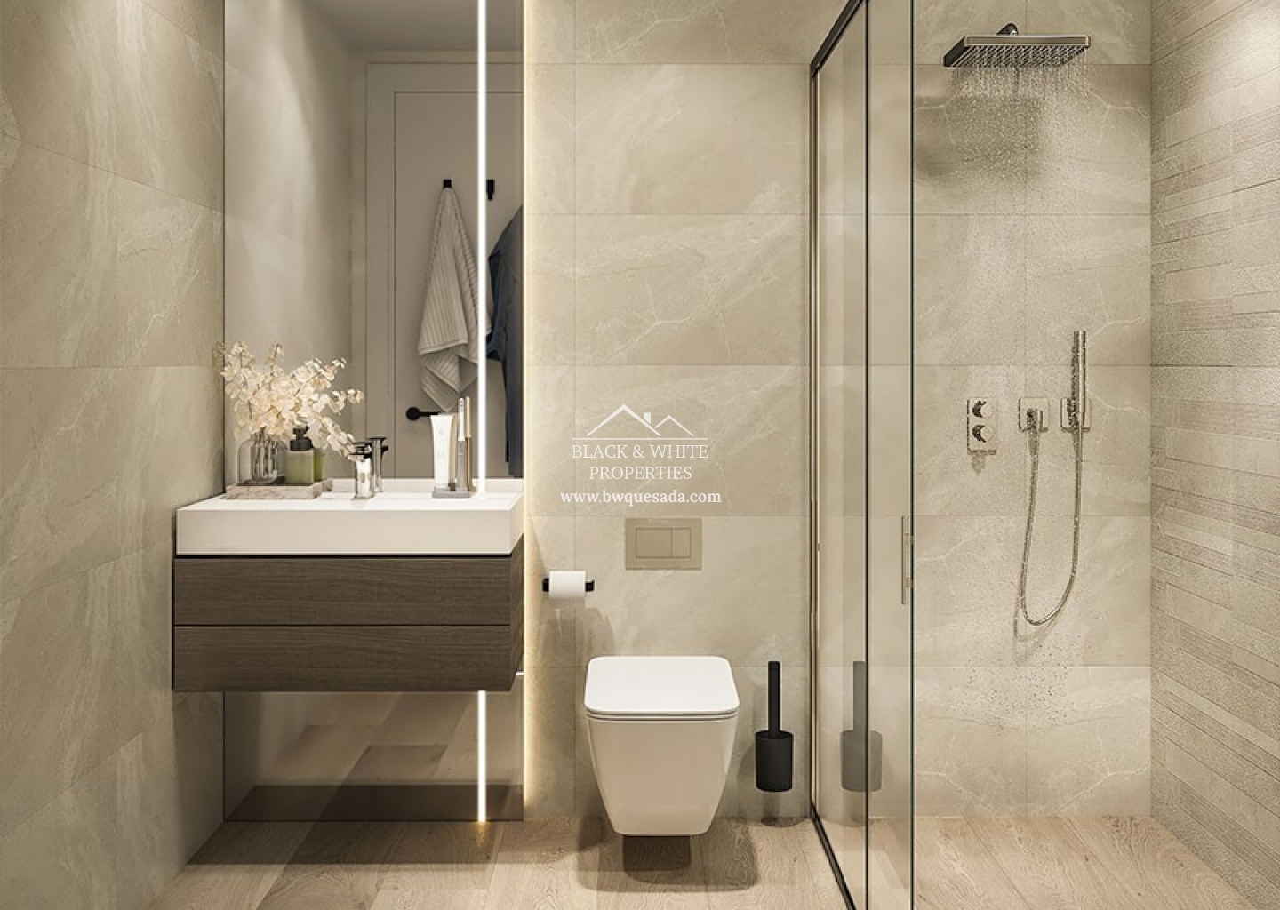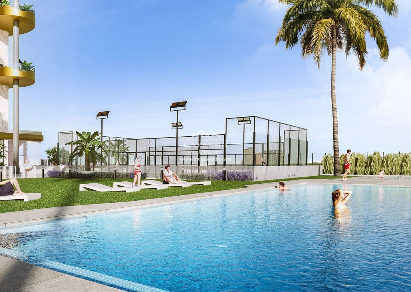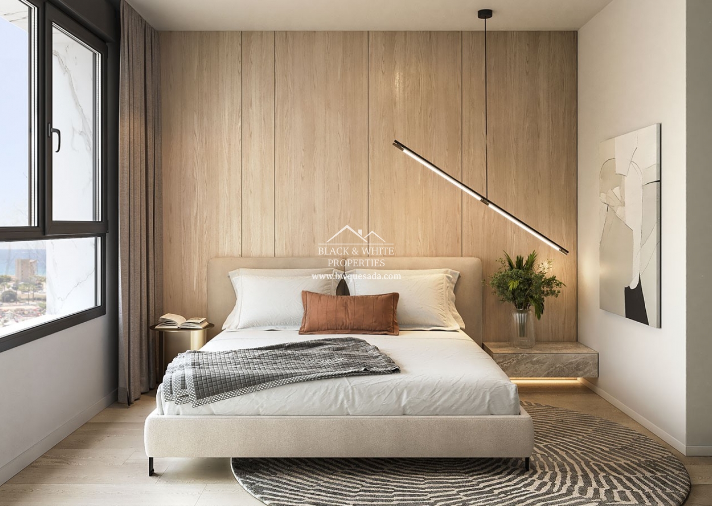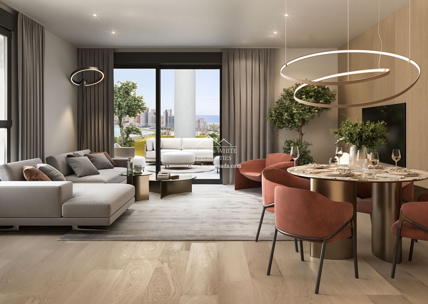 This magnificent new construction development is located in Calpe, on the North Costa Blanca. Each apartment has 3 bedrooms and a large terrace with views of the sea, the lagoon and the famous rock of Calpe, the Peñón de Ifach. The common areas include a swimming pool, paddle tennis court, gym, children's playground and a beautiful Mediterranean garden. The building is inspired by a tree with ceramic coating and golden leaves in the form of terraces. Equipped with luxury qualities, hot and cold AC, designer kitchen with all appliances and garage and storage room included in the price.