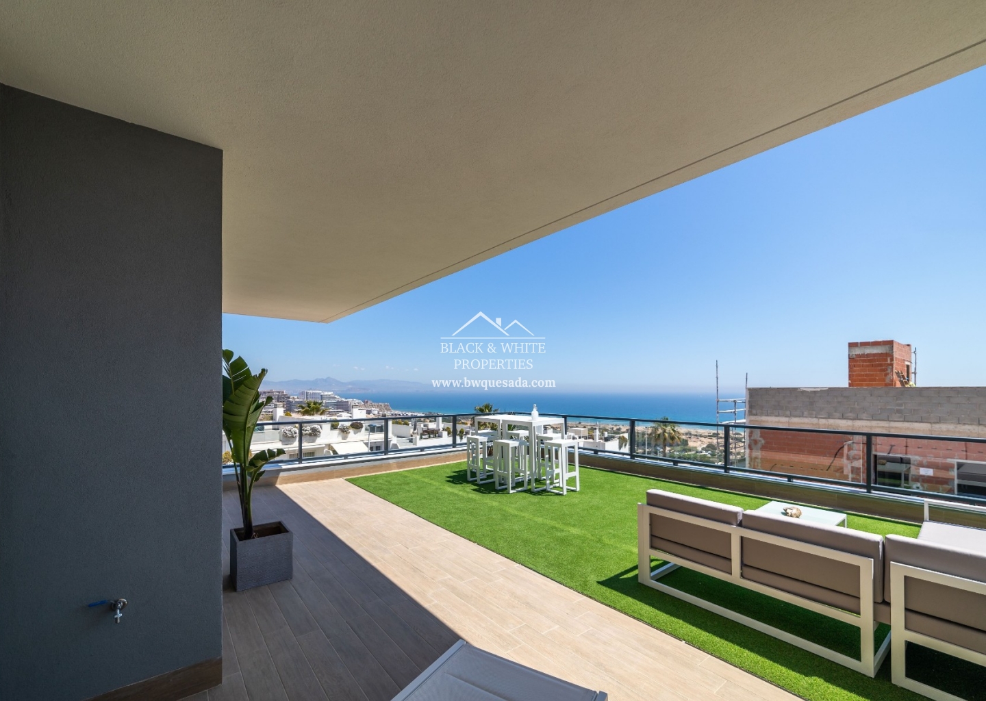 This residential consists of 170 apartments located in Gran Alacant, just 0.5 km from the beach with beautiful views of the Mediterranean Sea. These apartments are 2/3 bedrooms and 2 bathrooms with views of the sea, the pool and the private gardens of the urbanization.