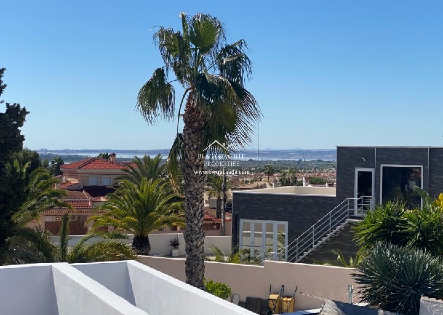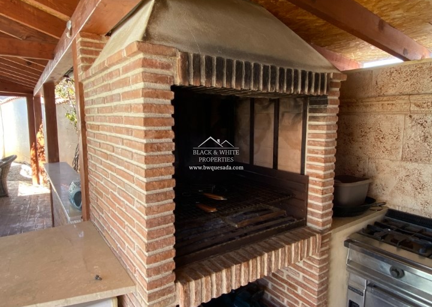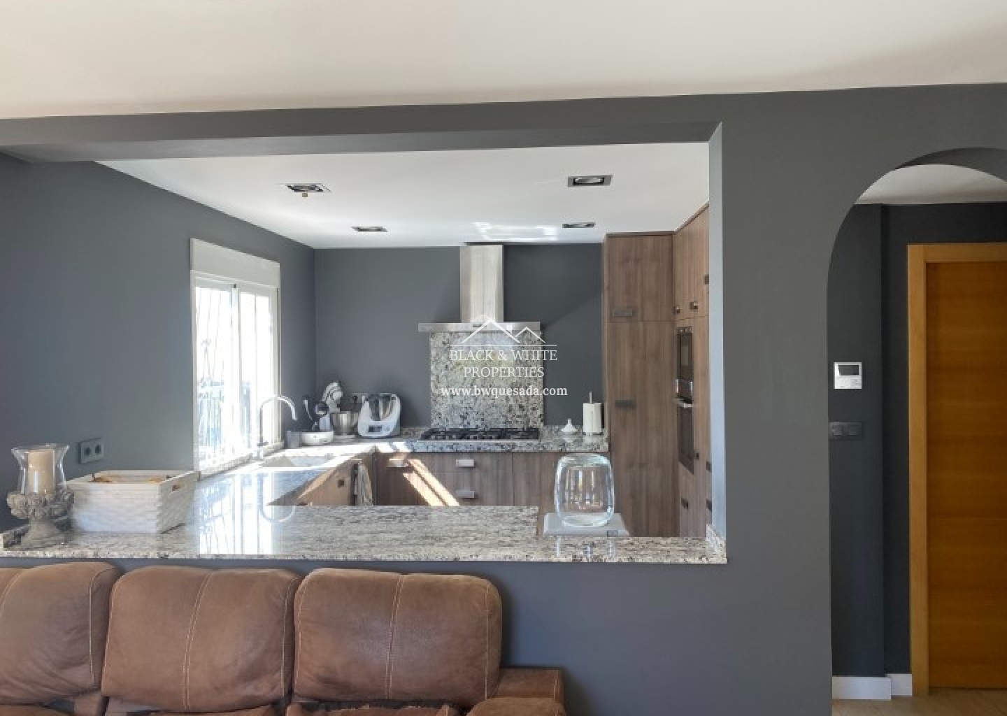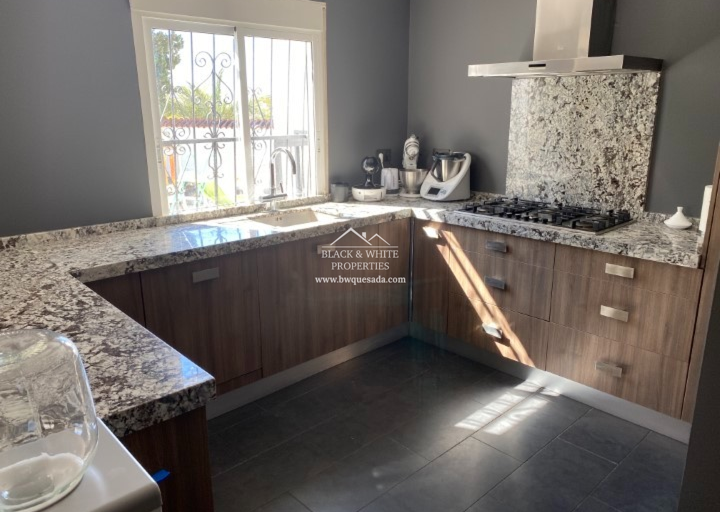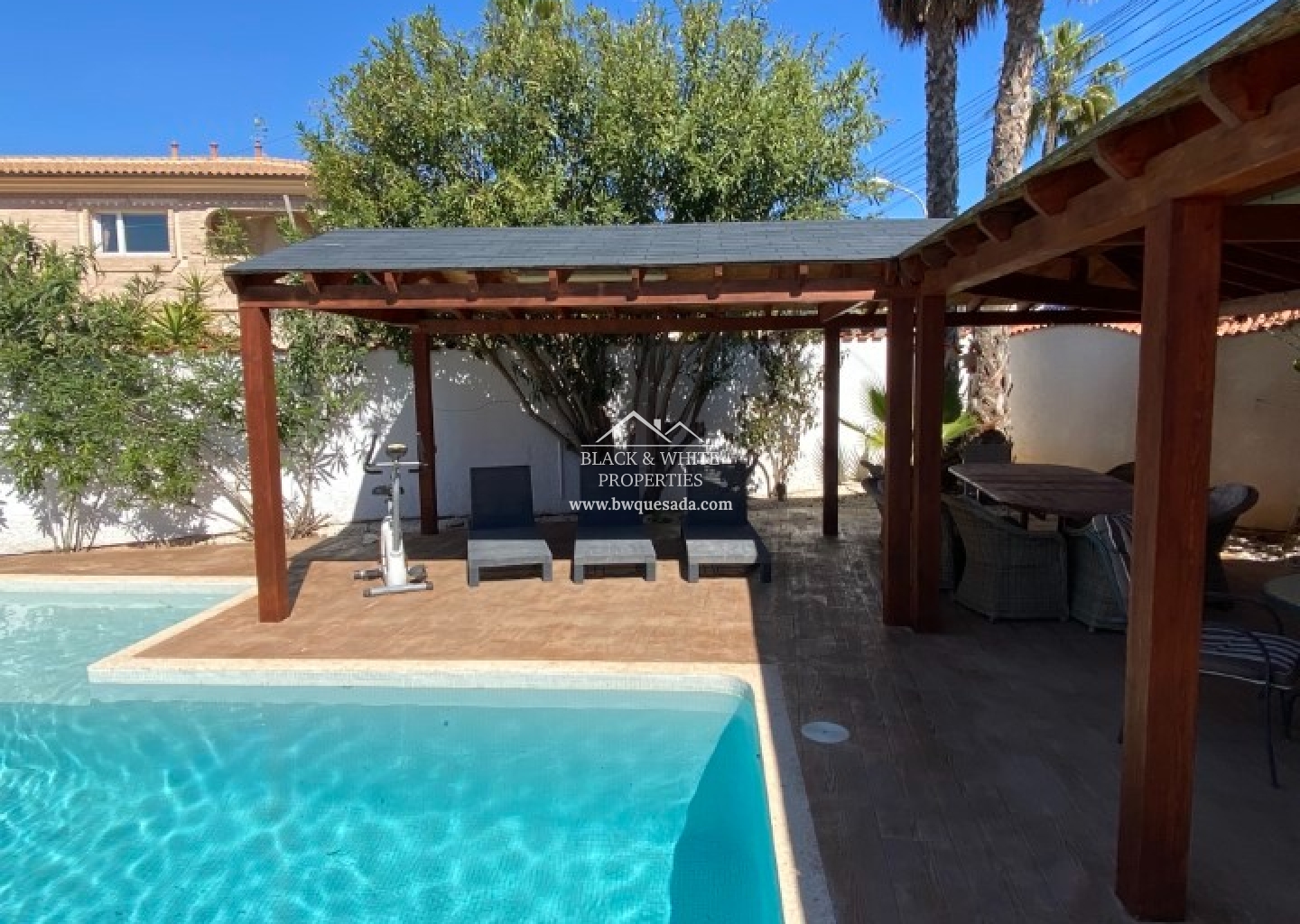 This large 3 bedroom, 2 bathroom villa sits perfectly on a 900 m2 plot of land in the heart of Quesada, within walking distance of a variety of amenities. The villa itself faces south-east and overlooks a private swimming pool, complete with jacuzzi, as well as a full outside summer kitchen and bar area. There is outside parking space for several cars. There are also 2 solariums that offer beautiful views of the lakes. Inside it has been completely renovated and modernised, and offers extras such as ducted air conditioning throughout.