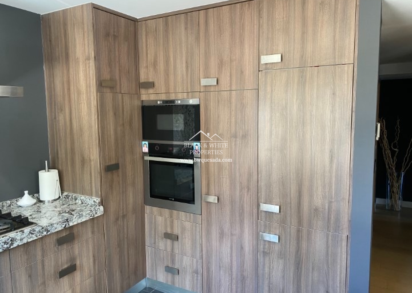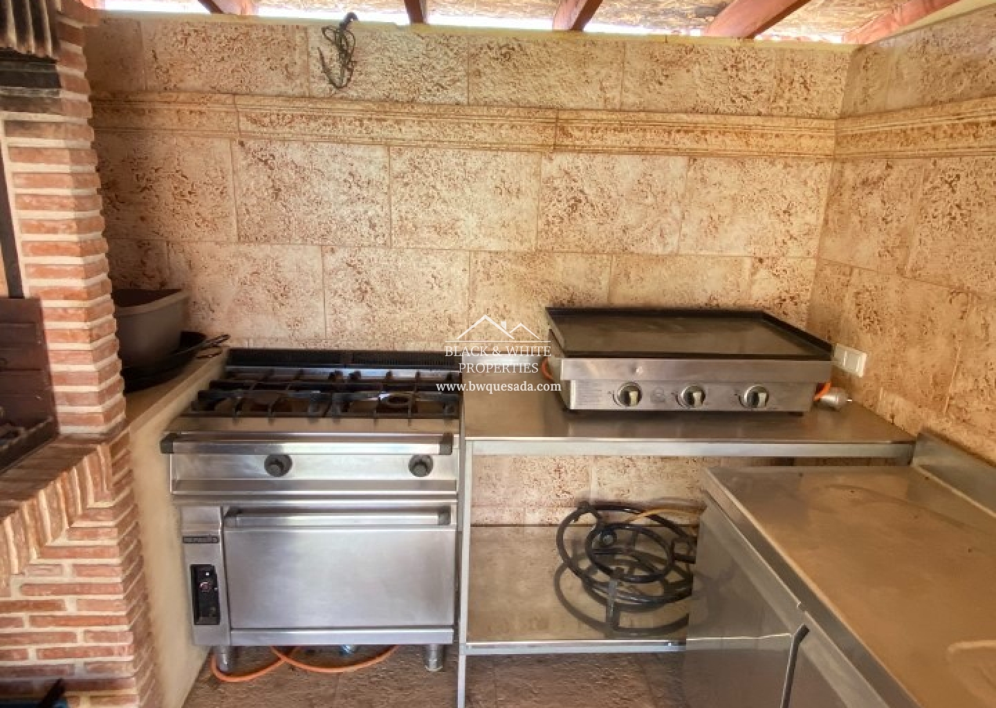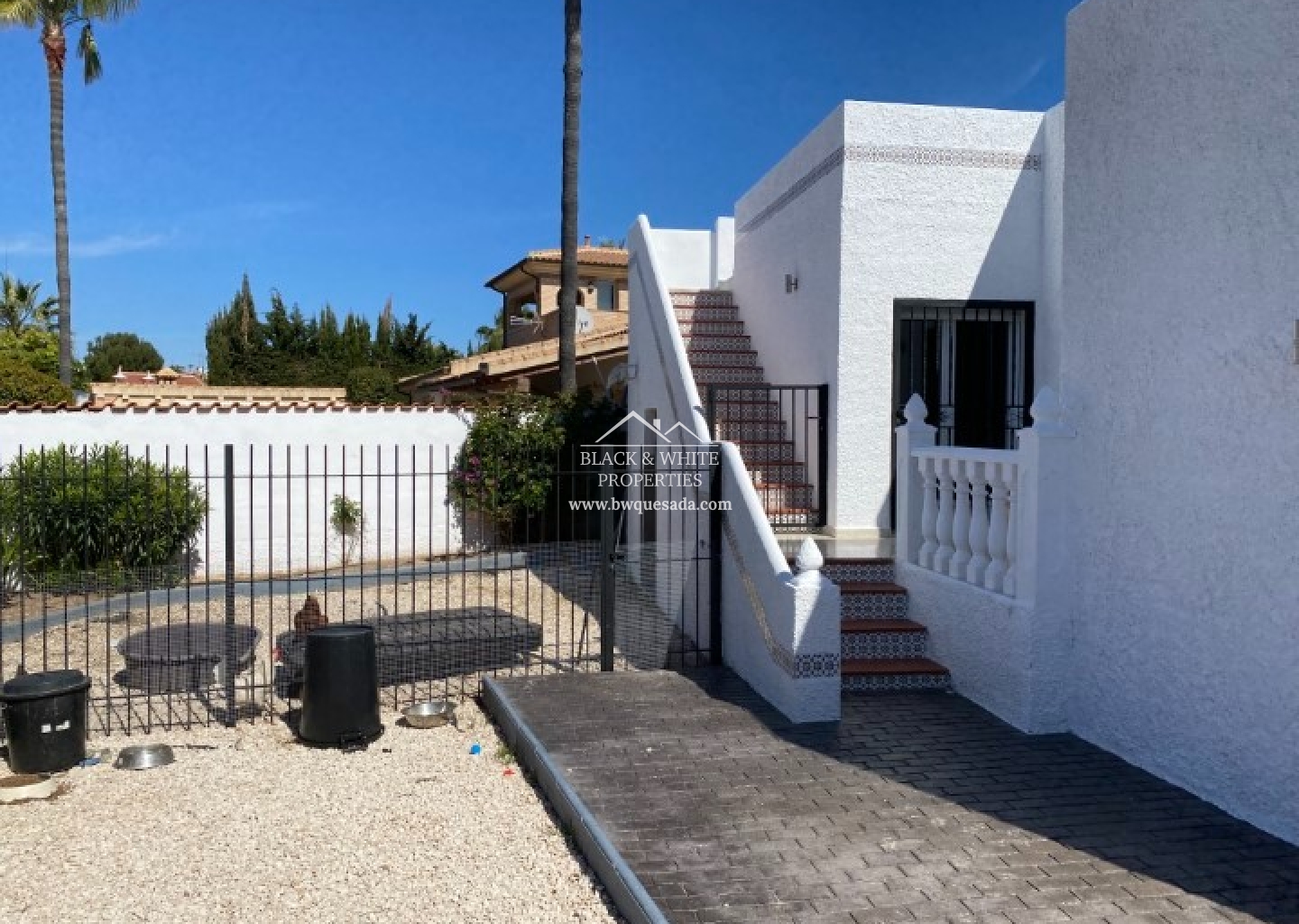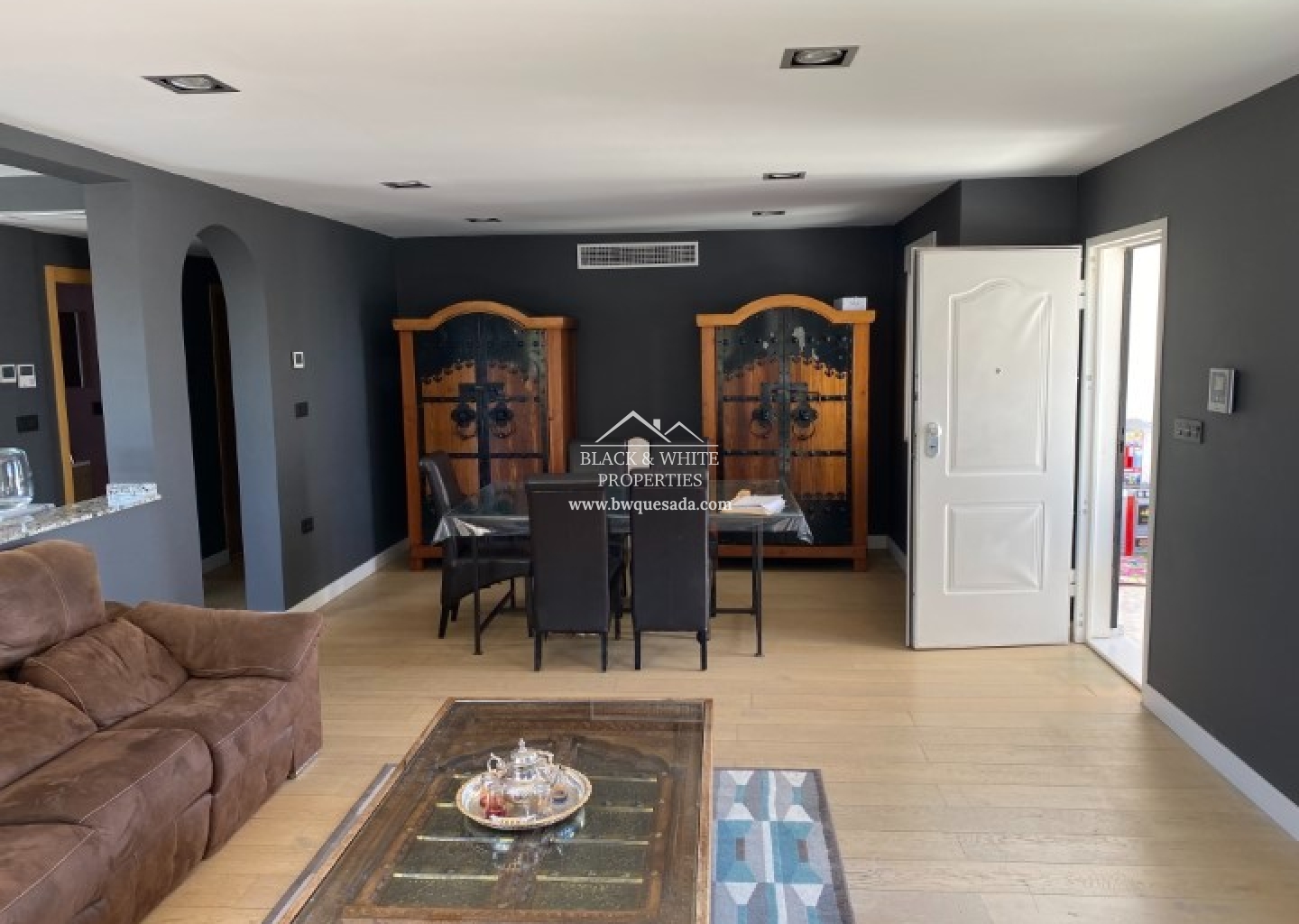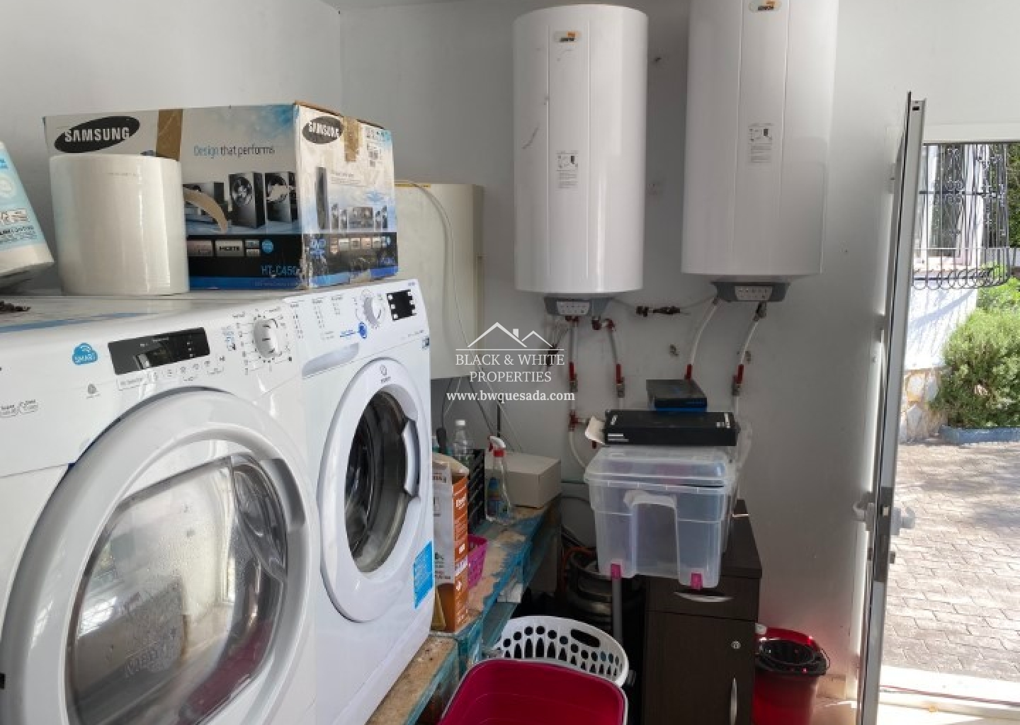 This large 3 bedroom, 2 bathroom villa sits perfectly on a 900 m2 plot of land in the heart of Quesada, within walking distance of a variety of amenities. The villa itself faces south-east and overlooks a private swimming pool, complete with jacuzzi, as well as a full outside summer kitchen and bar area. There is outside parking space for several cars. There are also 2 solariums that offer beautiful views of the lakes. Inside it has been completely renovated and modernised, and offers extras such as ducted air conditioning throughout.