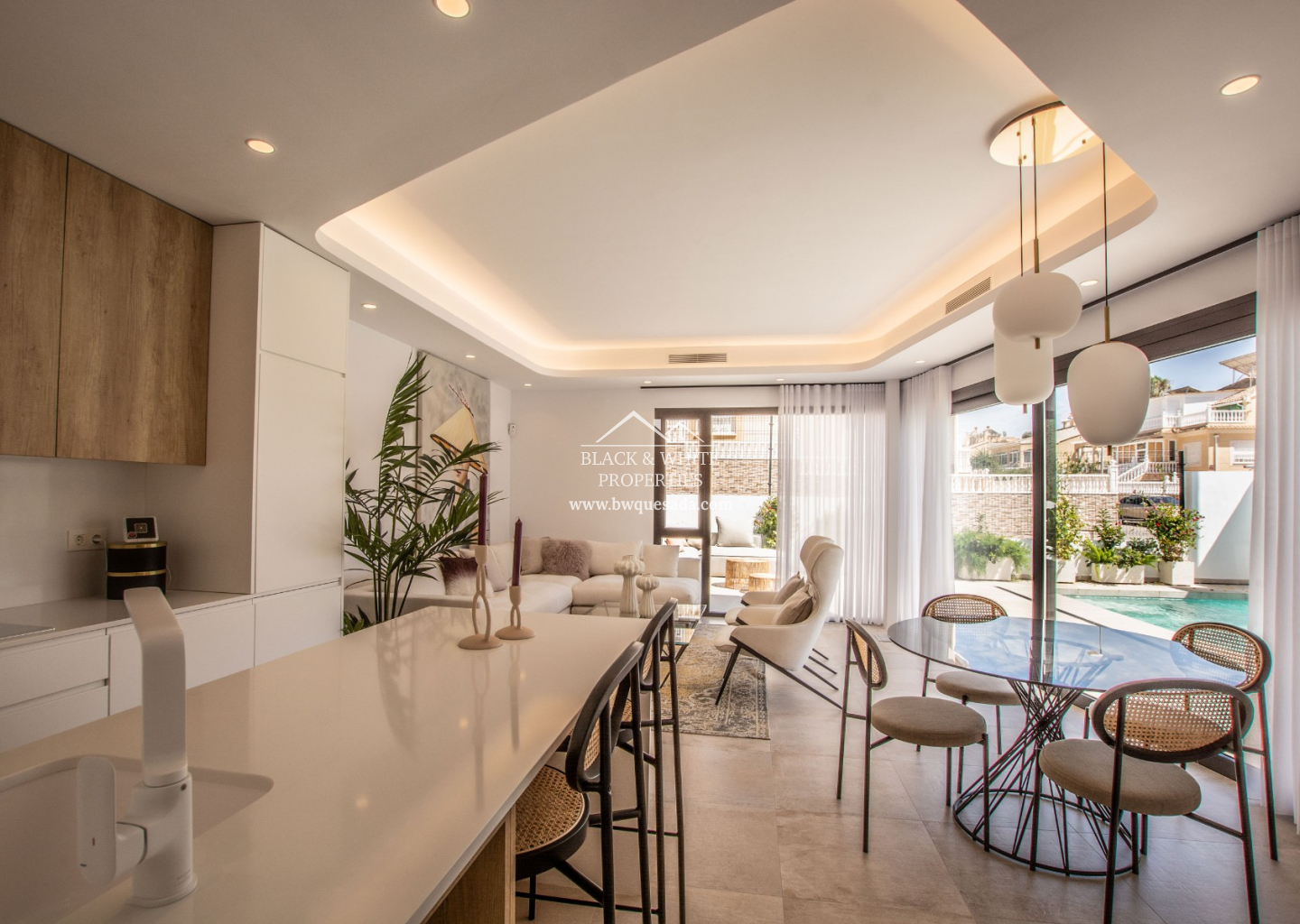 We are pleased to present this exclusive complex which offers 10 exquisite villas. Located in the prestigious area of Orihuela Costa. Enjoy the spacious villas with 3 bedrooms (2 of them with private bathroom), 3 bathrooms, an elegant living room and an open kitchen. Relax on the semi-covered terrace and enjoy the private pool. Each house has a solarium, a private pool and exclusive parking for your convenience. These villas have the following features: