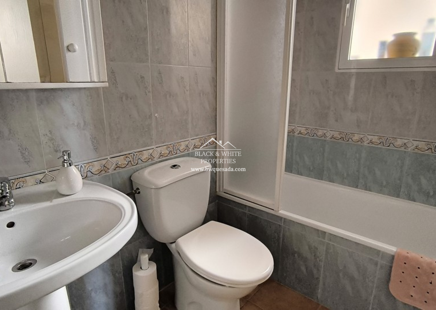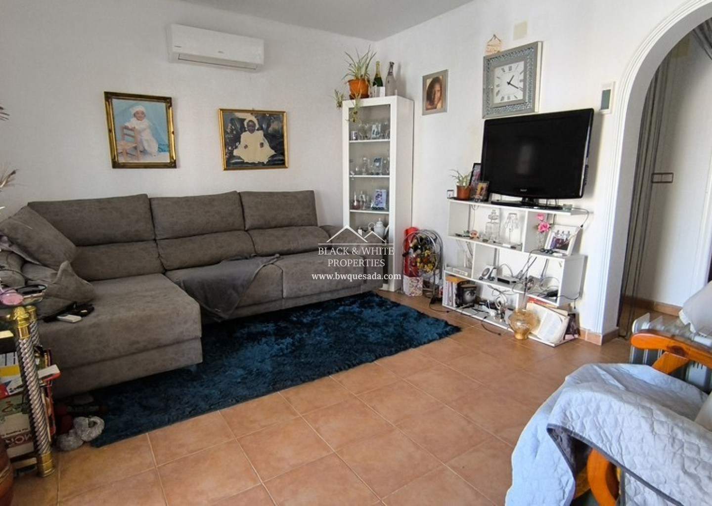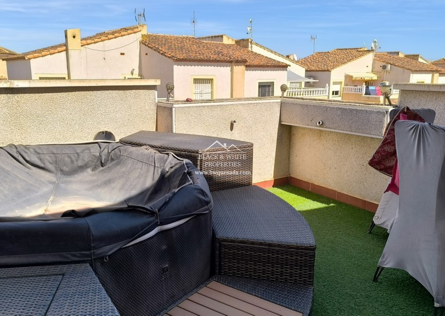 This spacious 3 bedroom, 2 bathroom quad villa in Montebello, Algorfa, offers comfortable living in a peaceful residential setting. The property includes off-road parking and a small, easy-to-maintain garden. A glazed-in front terrace provides a lovely spot to enjoy the sun while offering additional indoor space. Inside, the villa is in excellent condition. The ground floor features a bright lounge-diner, a well-equipped kitchen with a breakfast bar and a handy storage room. The rear terrace has been enclosed and converted into a practical utility space. Also on this level, there is a spacious double bedroom with a fitted wardrobe and a family bathroom with modern fixtures. Upstairs, two further double bedrooms come with built-in wardrobes, providing plenty of storage. Another family bathroom serves this level. The highlight of the first floor is the private terrace, which boasts a jacuzzi and pleasant views of the surrounding area – perfect for relaxing after a long day. The villa is also equipped with air conditioning in the lounge and master bedroom.