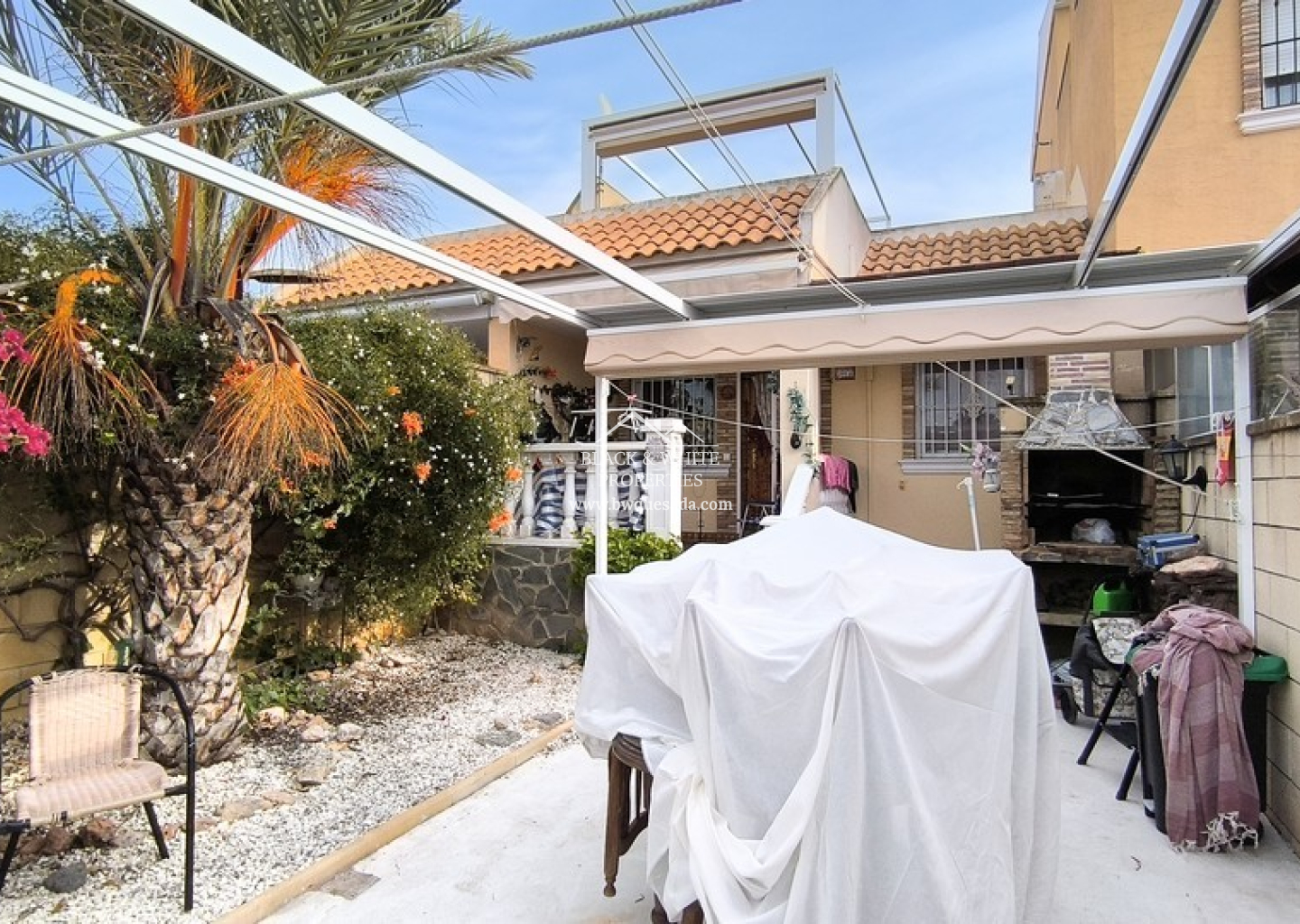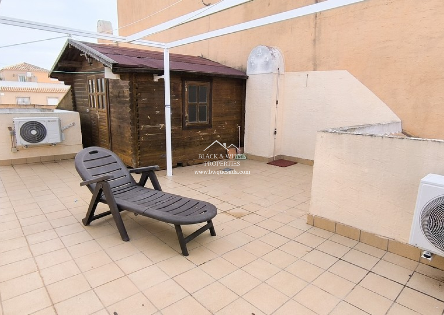 This 2 bedroom bungalow sits in the heart of the popular Lo Marabu area of Ciudad Quesada. The property offers off-road parking at the front and is accessed via a welcoming open terrace. Inside, the bright lounge creates a comfortable living space and flows naturally into the American-style kitchen. To the rear, a useful private courtyard houses the washing machine and spiral stairs leading up to a private solarium.  Up here, you will find a large wooden cabin offering excellent storage or flexible use. From the solarium, there are pleasant views across to the impressive communal swimming pool, which is conveniently located just over the road. Both bedrooms are generous in size and offer good natural light. A well-maintained family bathroom sits neatly between them, adding to the practical layout of the home. A real bonus lies beneath the property, where three spacious storage rooms provide valuable extra space rarely found in similar homes.